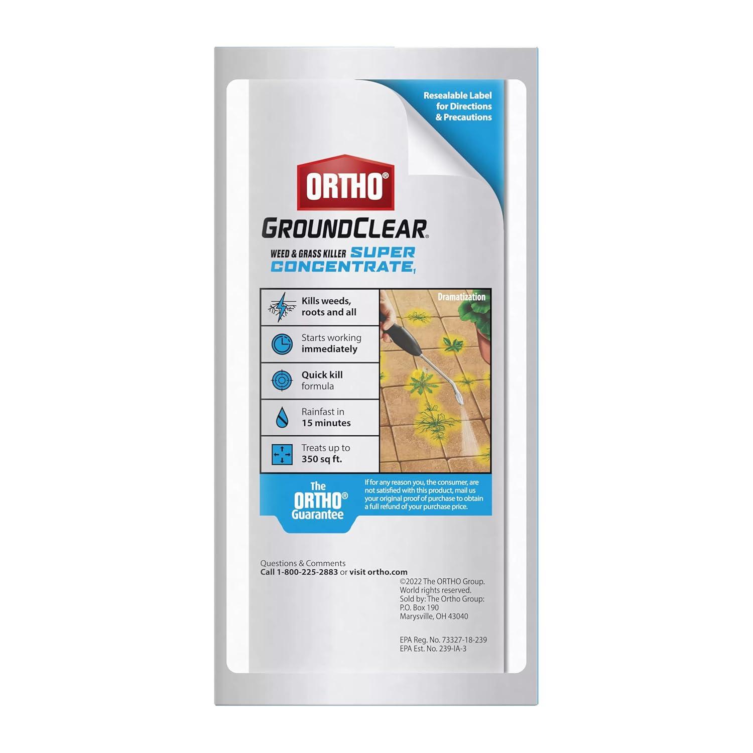 Ortho® GroundClear Weed and Grass Killer Super Concentrate1 kills the toughest weeds & grasses to the root. Weed killer provides broad-spectrum control of weeds and grasses with ingredients that work on contact. Ortho® GroundClear® Weed & Grass Killer Super Concentrate1 is ideal to use around perennial landscape plants, shrubs, trees, patios, walkways, driveways, in gravel or mulch beds. To use: 1)Unscrew cap from pouch and empty entire pouch into a reusable Ortho® bottle or tank sprayer 2) Fill bottle or tank sprayer with 1/2 gallon of water 3) Securely screw cap onto bottle of sprayer 4) Shake gently 5) Spray as directed. One 1/2 gallon covers 175 sq. ft. Spray only the weeds that need killed by thoroughly wetting the foliage to cover, but do not spray to runoff. Apply when weeds are actively growing and when the air temperature is above 60 degrees with calm air. Sprayed weeds will begin to wilt within hours after application, with complete kill in 1-2 weeks. A single application controls most listed weeds.